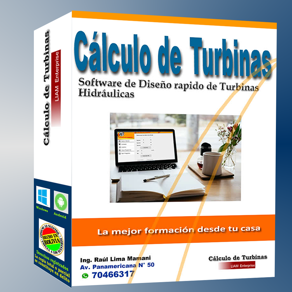 CALCULO DE TURBINAS es un software de aplicación dirigido a la preparación, y práctica de diseño de Turbinas Hidraulicas. Puede ser usado por Escuelas, Colegios públicos y privados, institución educativas y estudiantes en general que tengan directa o indirectamente necesidad de diseñar en forma práctica los diferentes tipos de turbinas hidráulicas.